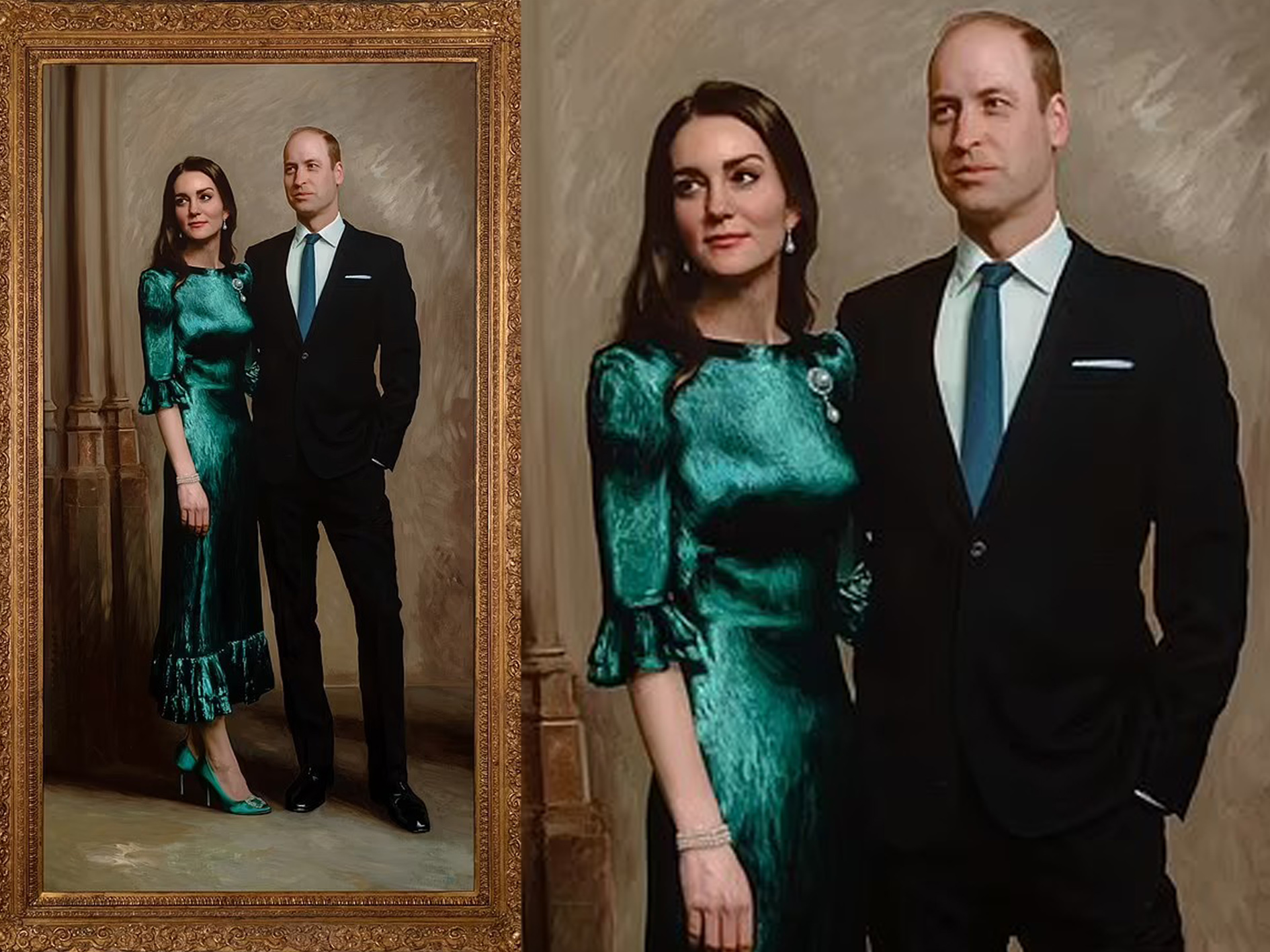 The first official joint portrait of the Duke and Duchess of Cambridge has been unveiled—and it sees a highlight of Kate’s royal wardrobe preserved for posterity. In the painting by award-winning British portrait artist Jamie Coreth, the Duchess is wearing her emerald Falconetti dress by Susie Cave’s label The Vampire’s Wife, the same one she wore for a trip to the Guinness factory in Dublin back in 2020.