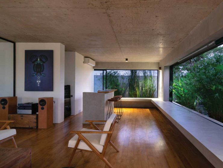 Located in the densely populated suburb of Rajagiriya, Striated House faces a marsh and is surrounded by tall buildings on three sides. While the main house faces the marsh to the north, its western façade (which overlooks the street) is solid with concrete fins.