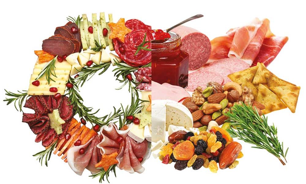 To arrange the wreath, begin by placing the salami around the wreath; then placing little bowls of jam and chutney around the edges.