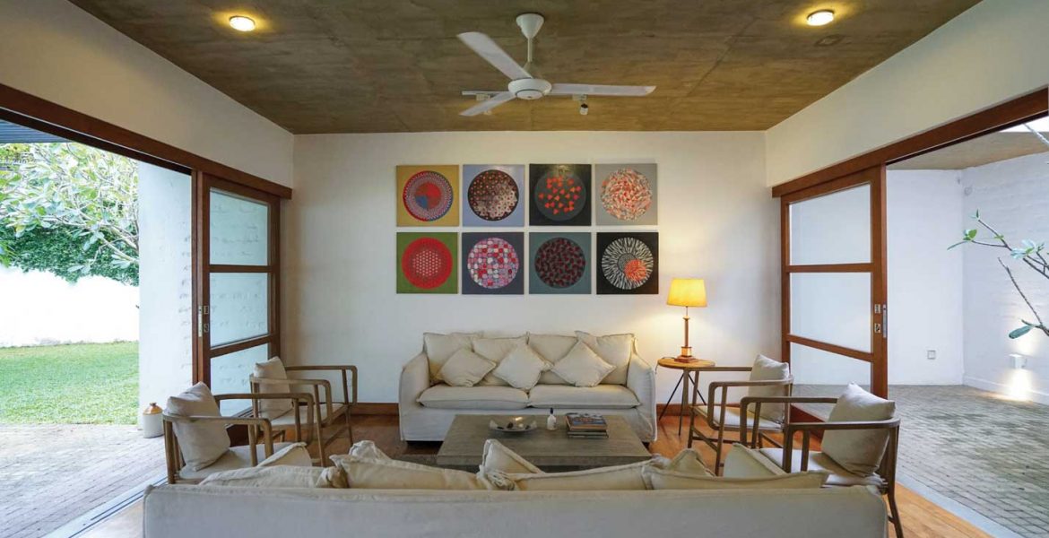 This five bedroom house is located on Kumaratunga Munidasa Mawatha (formerly Thurstan Road) in front of Royal College Primary School. It was the client’s ancestral property; but since the old house was inadequate for her needs, it was demolished. By doing so, it was possible to begin fulfilling the client’s requirements. Because she wanted a large garden, the structure was located perpendicular to the main road. It’s a linear building comprising ground plus two floors and its smaller footprint allows for a large garden on the side. The short side faces the path of the sun, and the public spaces and bedrooms face east, and out to the garden. A courtyard separates the service areas from the main house and the service block was placed in front so that it functions as a buffer against the noise from the main road. The ground floor has living and dining areas, and one bedroom. A paved terrace connects this space with the garden. There are staffrooms, two bedrooms and a living/working space on the first floor, which is where the occupant spends most of her time. The second floor has two guestrooms and a large terrace with views of the surrounding neighbourhood.