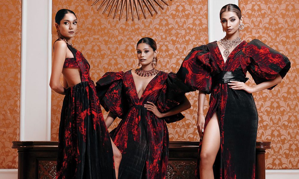 During these difficult times, designers are innovating in conceptualising and creating their distinctive outfits. In this instance, the designer’s creations were printed on leftover white bridal satin and silk. And then the fabric was pleated to create a totally new look.