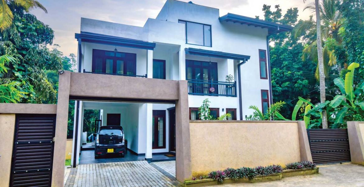 This spacious two storey house with an open rooftop terrace is located in the hill capital Kandy. The unique feature of the Amunugama Project is that the living room, dining room and pantry on the ground floor have been blended, to create a more open and spacious area. A simple roof design (single pitch) helped keep costs to a minimum. The double height of the space creates more air circulation, which ensures that the house is always cool and airy. And the open space and extra height of the ground floor (which occupies 1,302 sq ft) enables easy communication between the ground and first floors. An elegant flight of stairs, which displays neat woodwork that’s enhanced by warm tones, takes you to an open area complete with a small balcony on the first floor. This space is used as the TV room. The first floor spans 1,044 sq ft and includes four expansive yet minimalistic bedrooms, and a common bathroom that’s designed with modern touches and a greyscale colour scheme. A rooftop terrace with a connecting enclosed space opens out to a beautiful vista of treetops and is ideal for private gatherings.